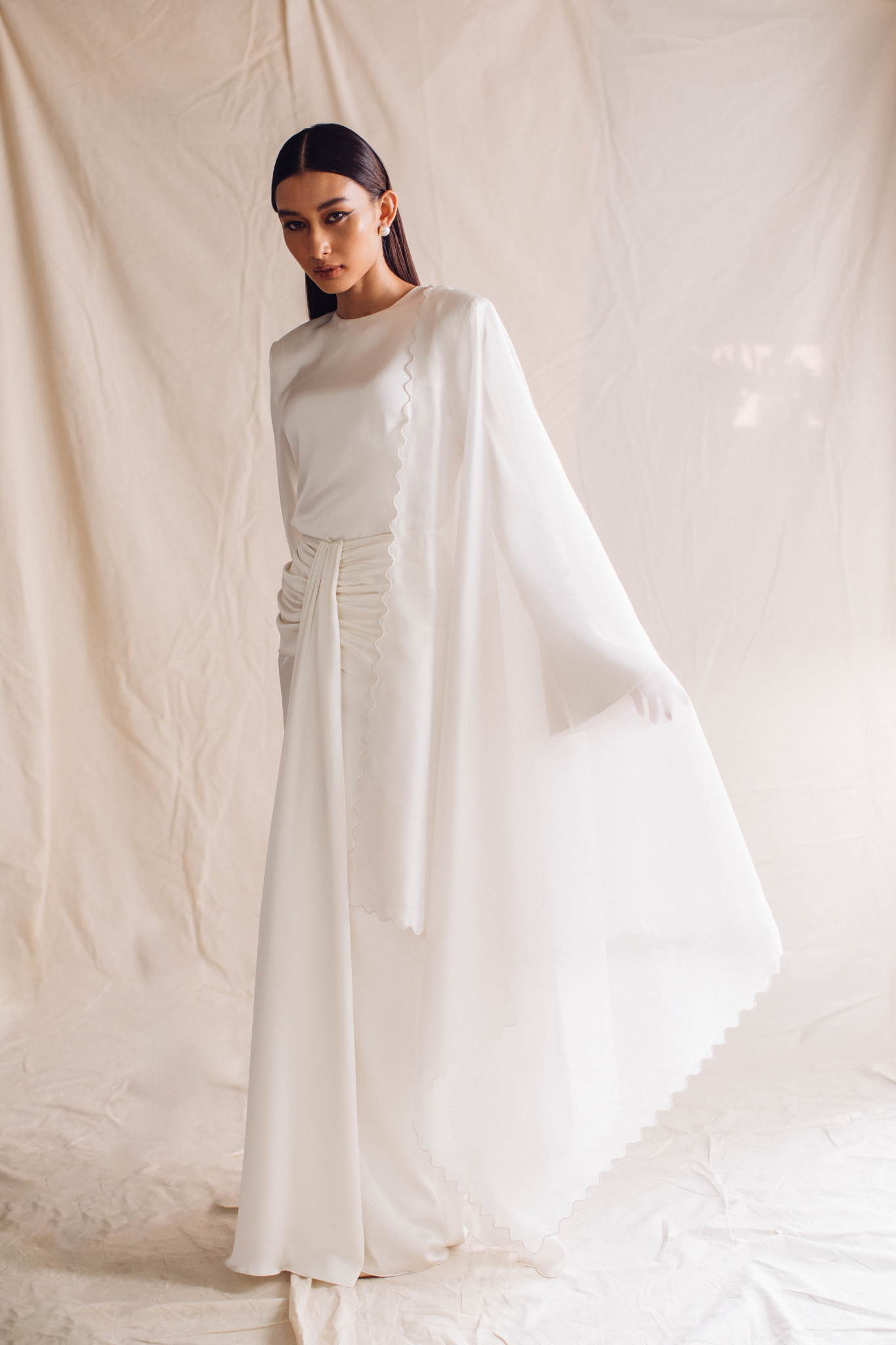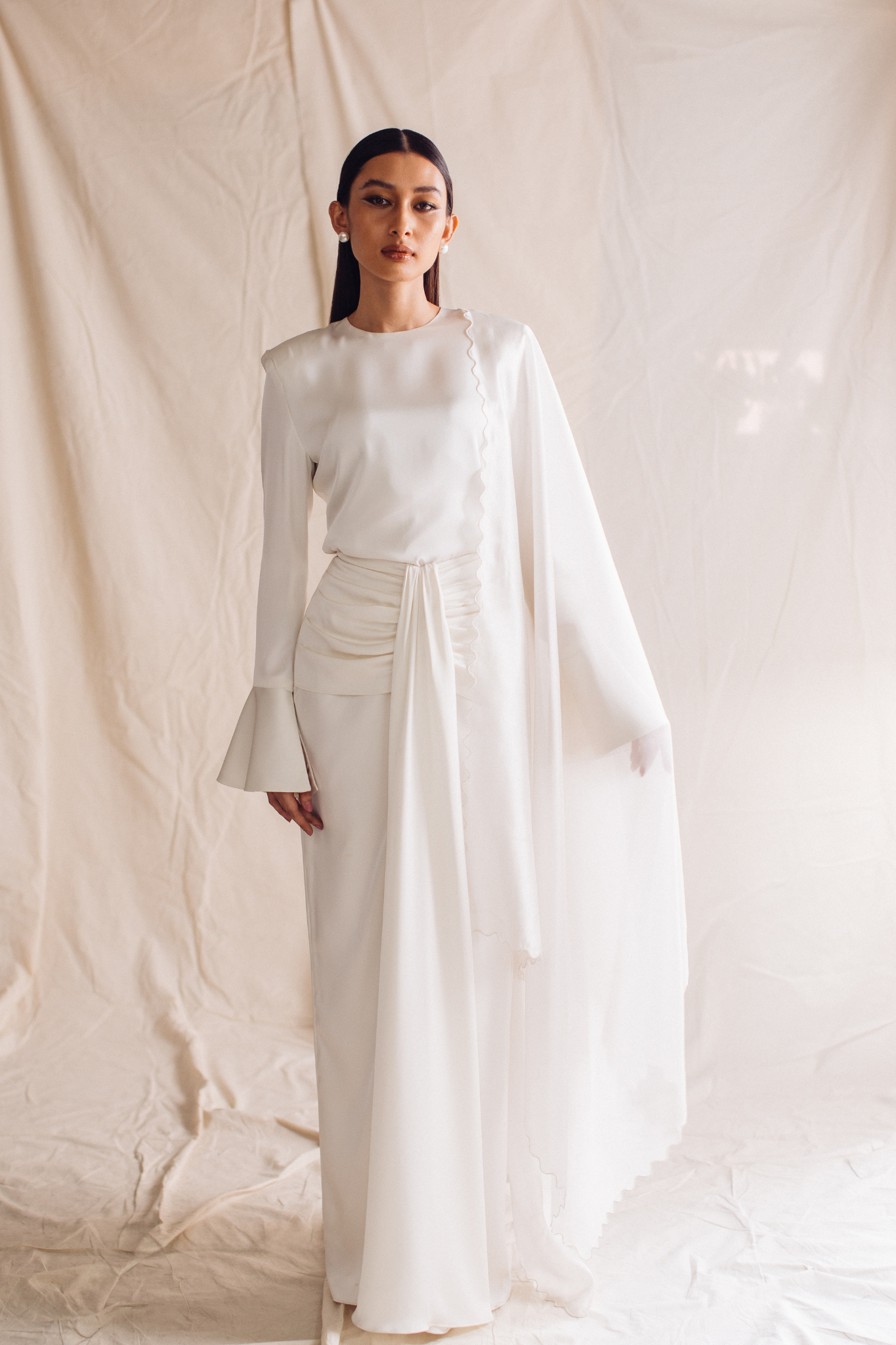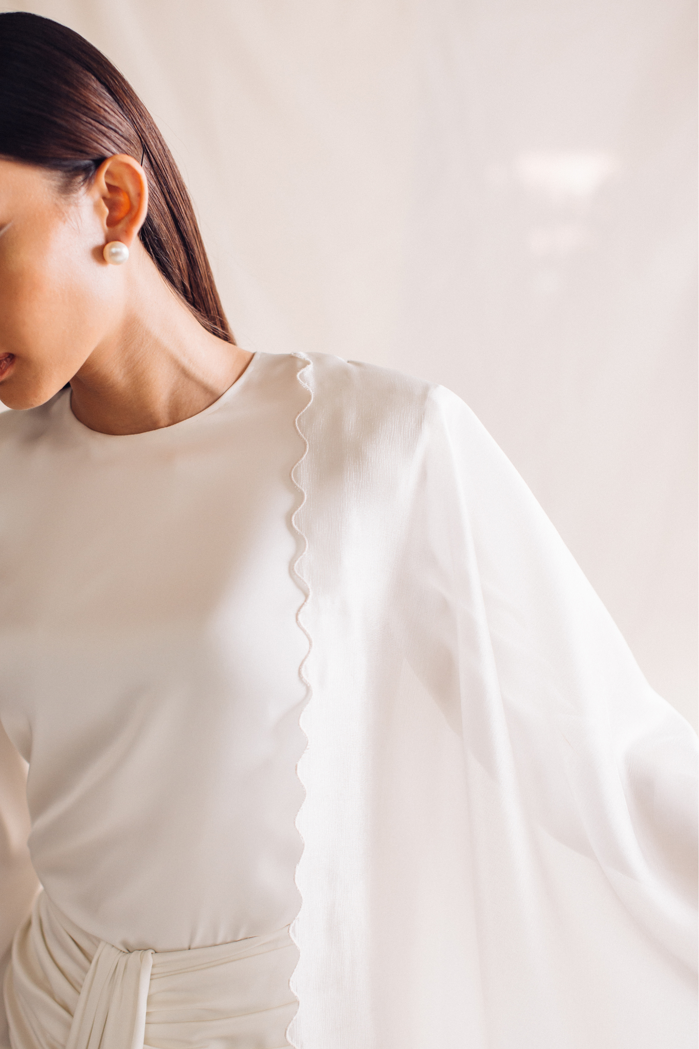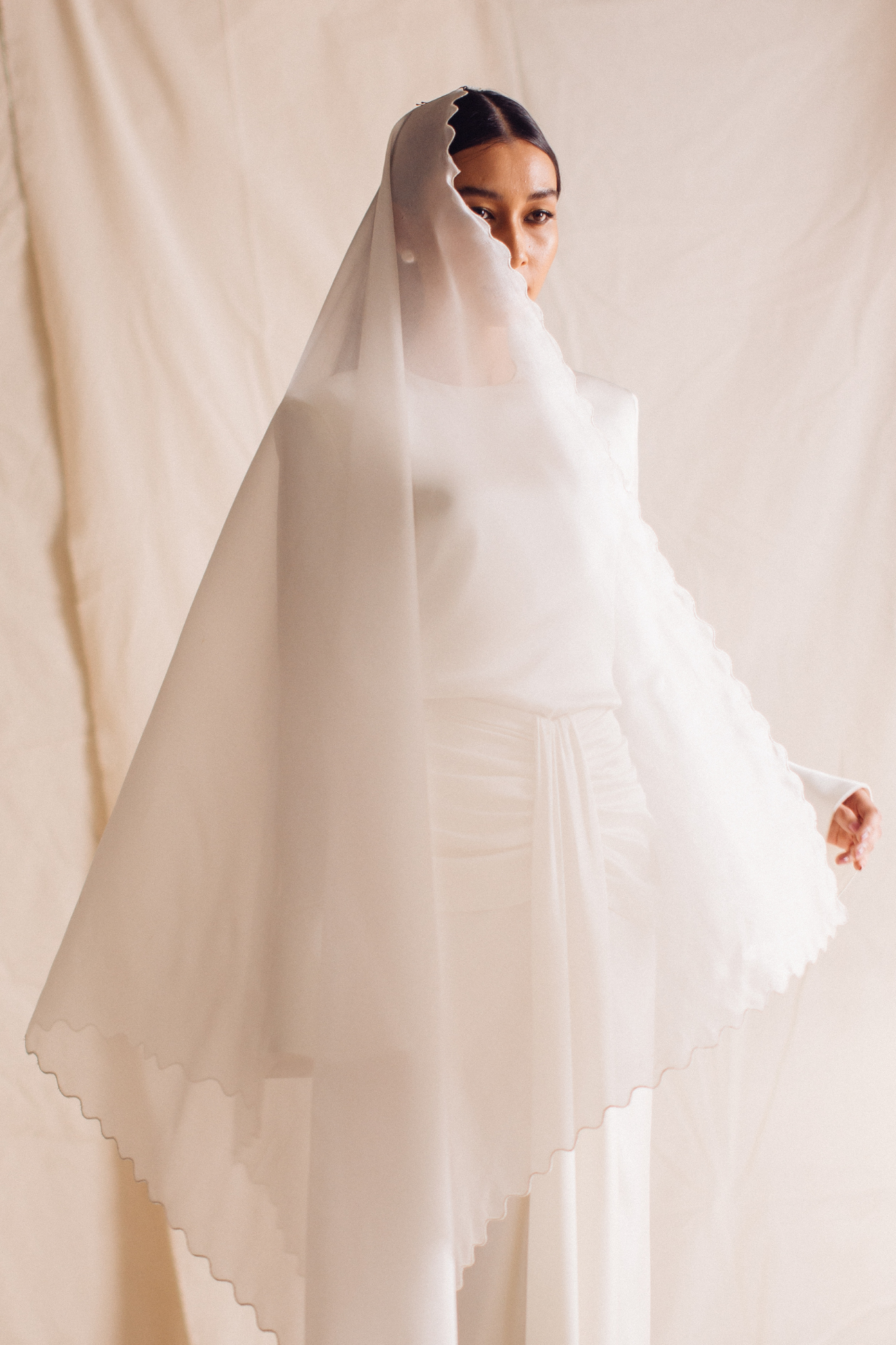 Organza selendang with sulam biku detailing.