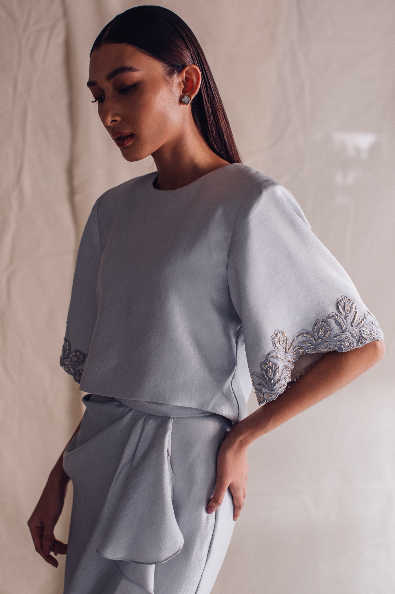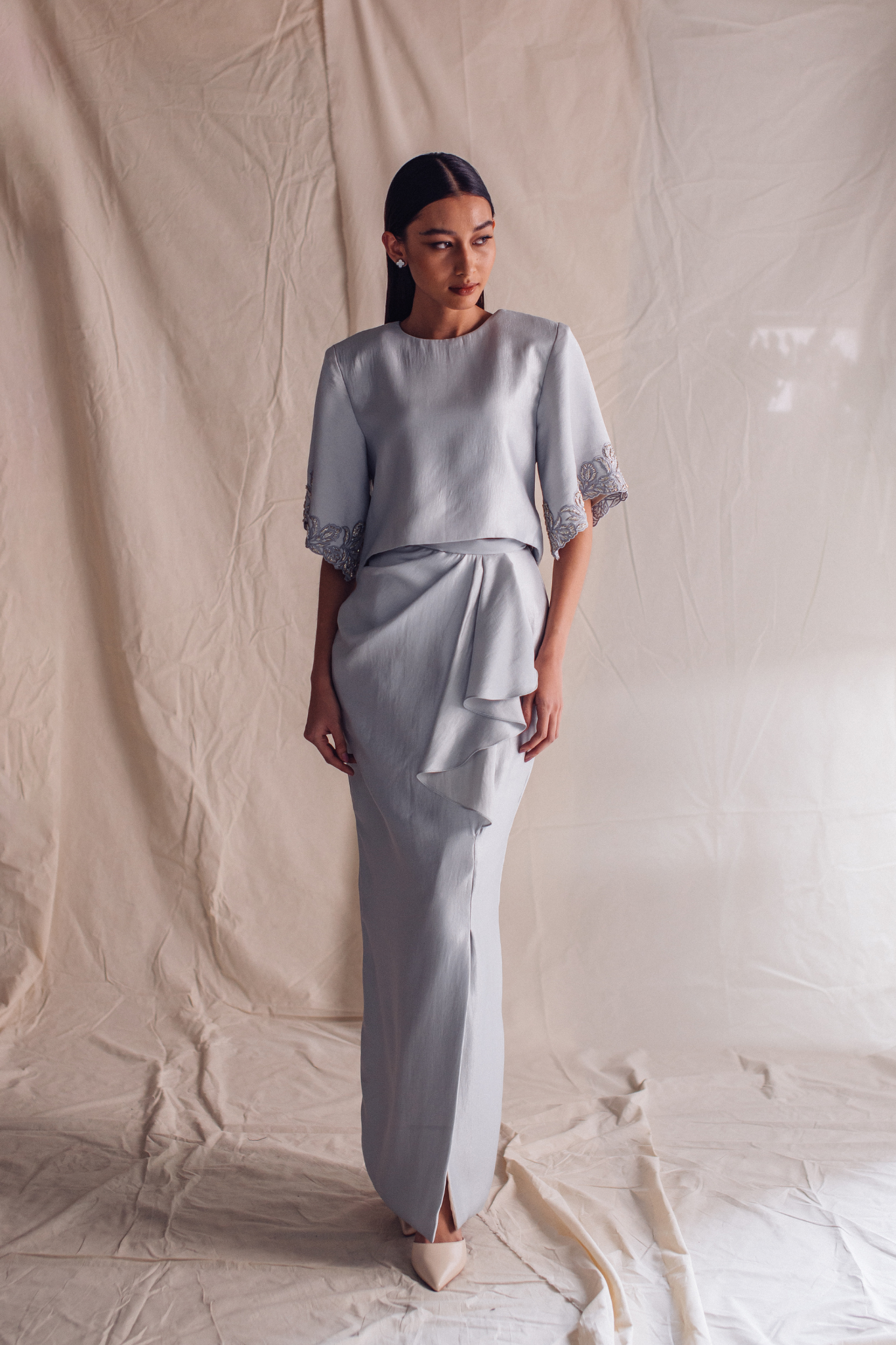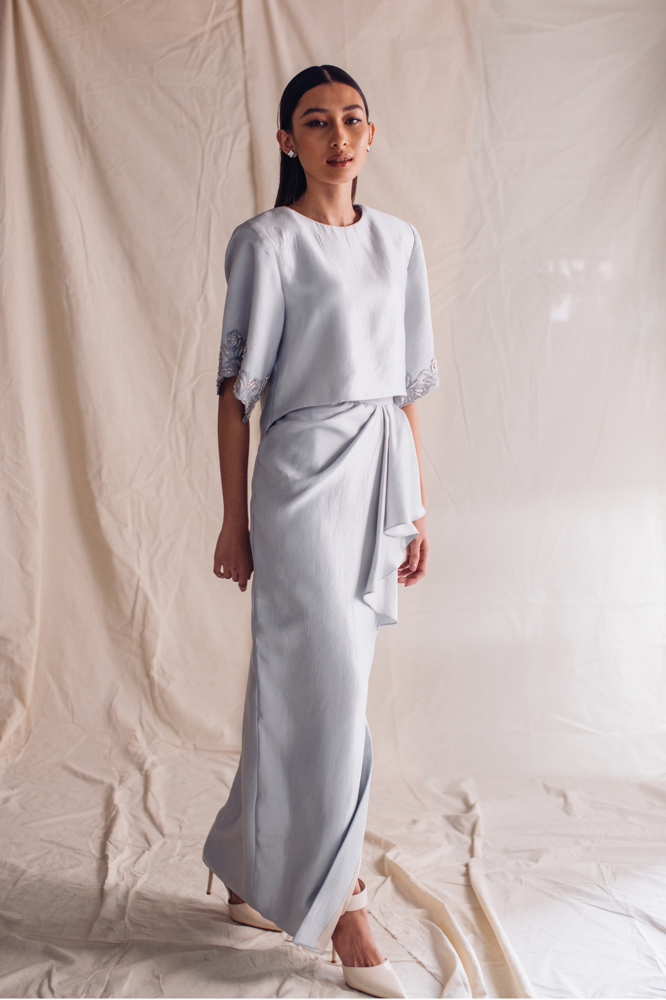 Kurung Kedah with a softly draped skirt.Finished with embroidery and glass beads in fluid crepe.