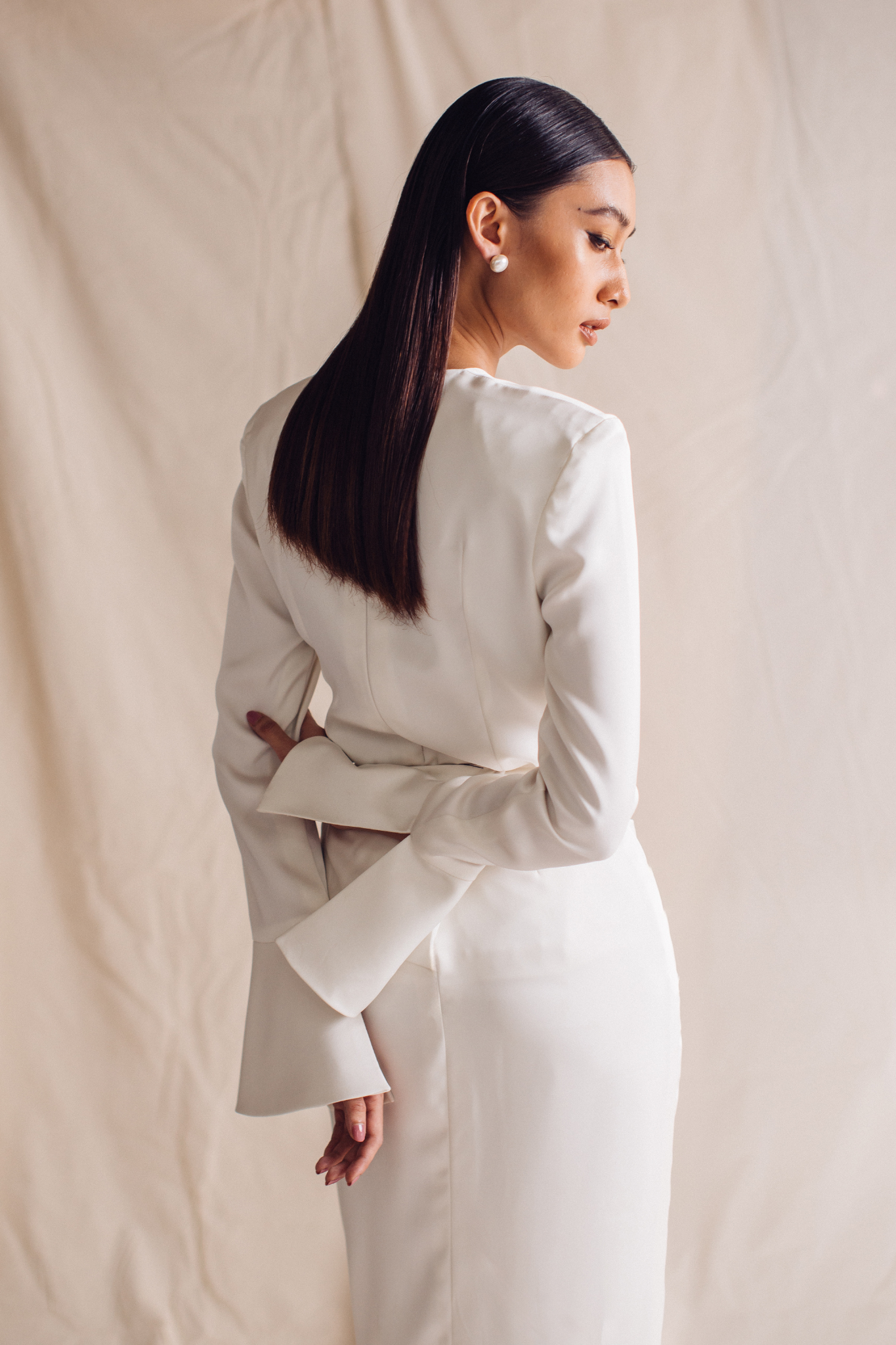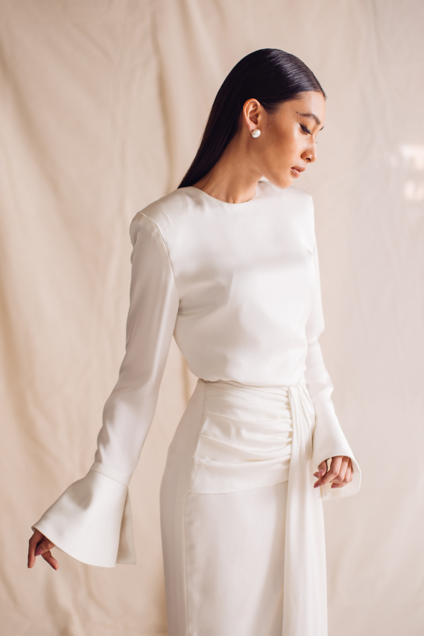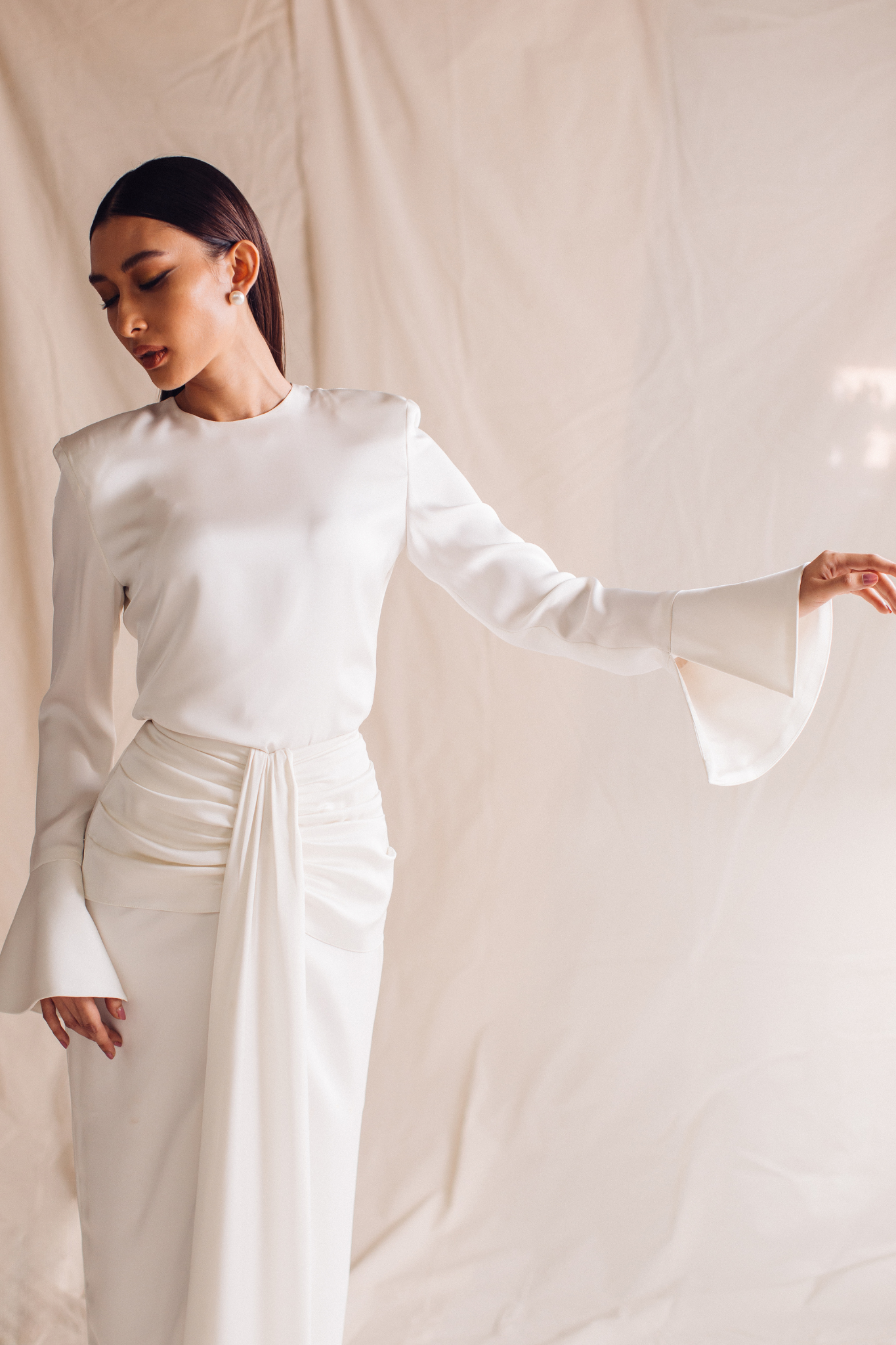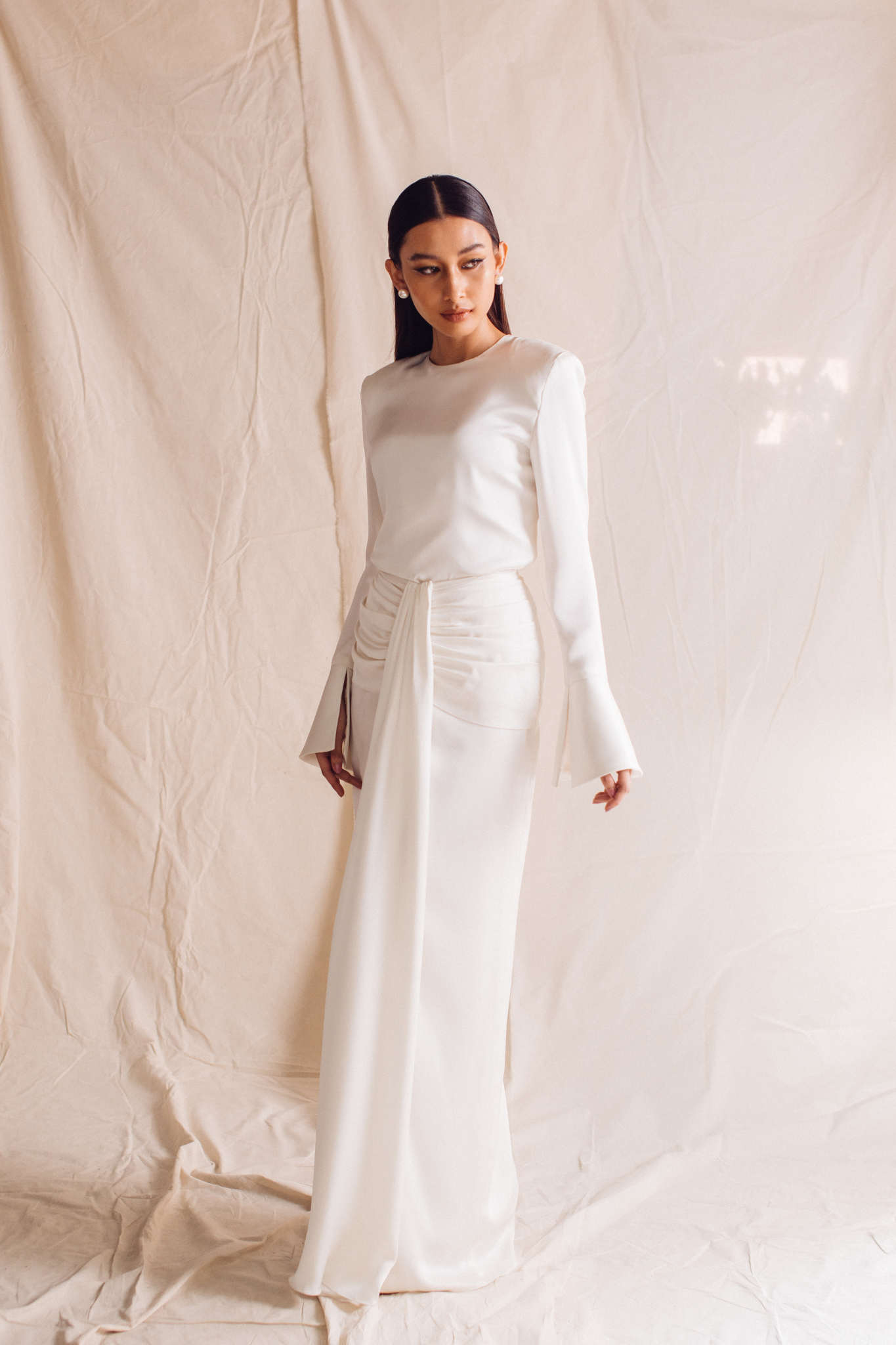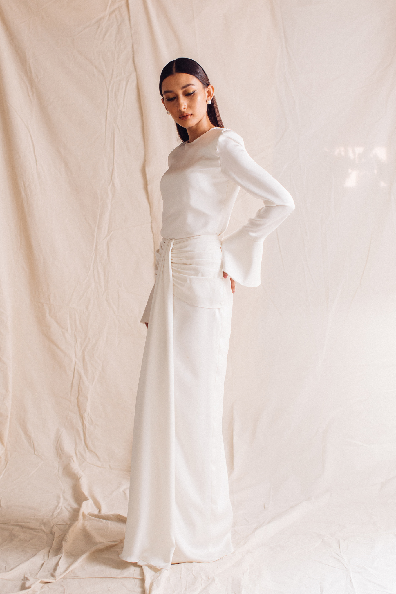 Modern kurung with structured shoulders and a draped skirt.Crafted in matte crepe satin.